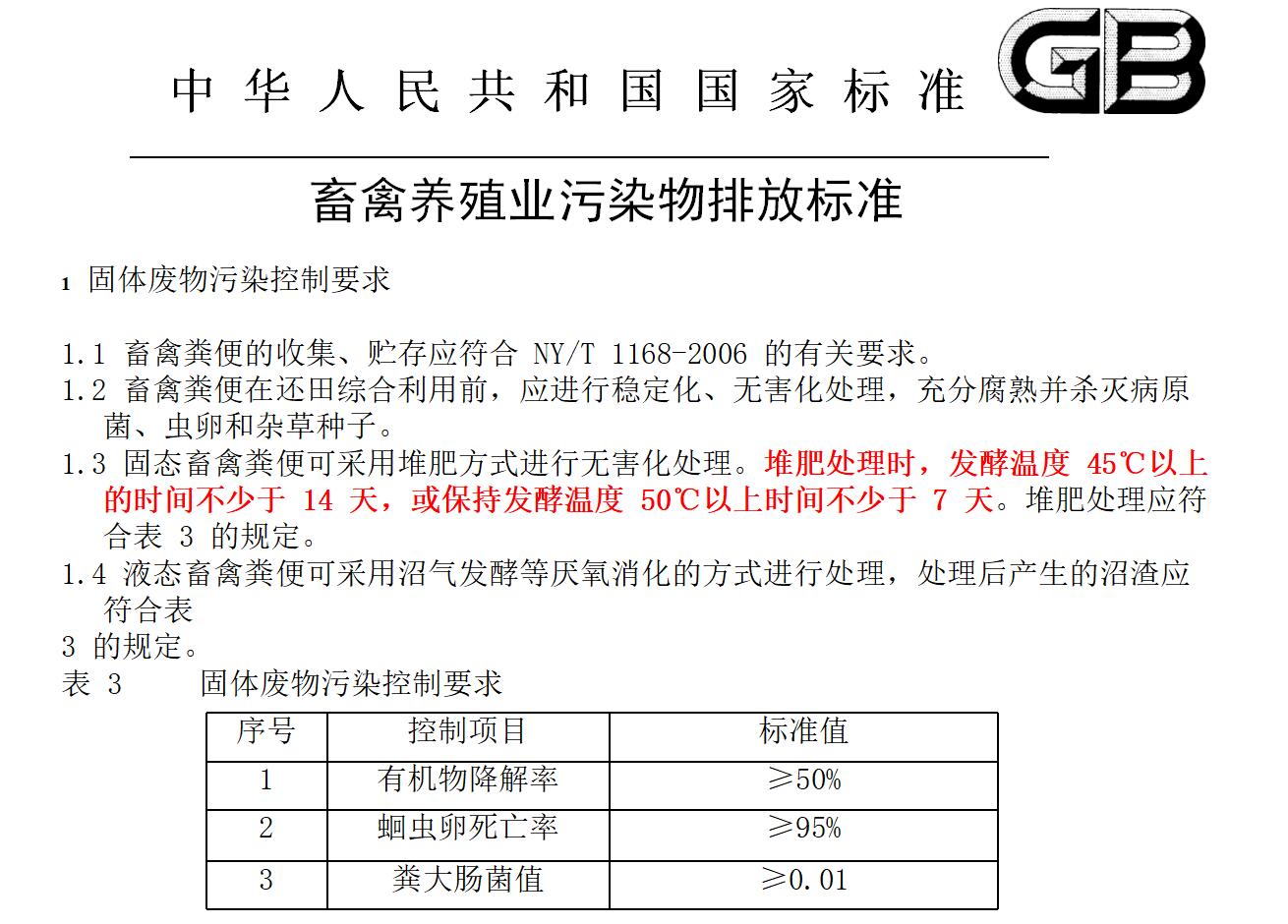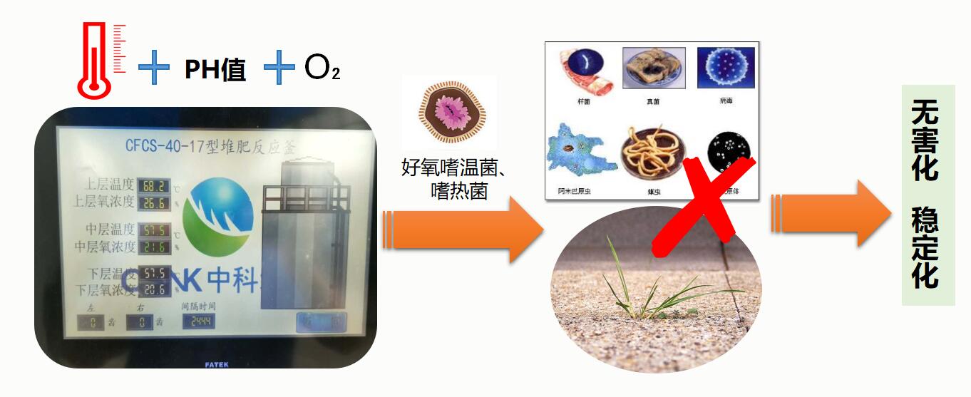 好氧堆肥發(fā)酵過(guò)程是一個(gè)微生物學(xué)處理過(guò)程,在一定溫度和PH值下,供氧通風(fēng),利用好氧嗜溫菌和嗜熱菌對(duì)其中有機(jī)物進(jìn)行生化分解,降解成穩(wěn)定腐殖質(zhì)。同時(shí),利用發(fā)酵過(guò)程中產(chǎn)生的溫度(一般達(dá)55-60℃,最高溫度可達(dá)70℃)殺死病原微生物、寄生蟲和雜草種子,以達(dá)到無(wú)害化處理指標(biāo)。
