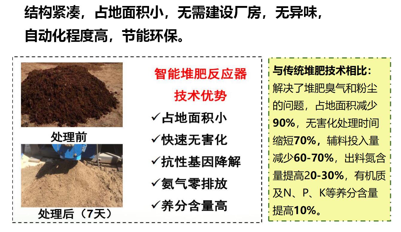 畜禽糞便有機(jī)肥發(fā)酵罐將儲(chǔ)存和處理過(guò)程合二為一,通過(guò)調(diào)氧控溫、理化固氮和微生物降解,實(shí)現(xiàn)畜禽糞尿處理時(shí)間縮短70% ,氨氣揮發(fā)減少53%,養(yǎng)分含量提高15%-20%,抗生素及抗性基因降解率超過(guò)90%。